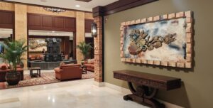 Enmarcada en una simulación de mampostería antigua, la madera de Pucté se convierte en el lienzo de una epopeya atemporal, celebrando la maestría del tallado y el poder inmutable del mito maya.